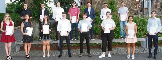 Mit der Überreichung der Reifezeugnisse ist für die Abiturienten des Frankenberger Gymnasiums Edertalschule ein denkwürdiges Schuljahr zu Ende gegangen. Bei der Verabschiedungsfeier, die wegen der Corona-Pandemie kurzfristig auf dem Sportplatz der Schule stattfand (wir berichteten), wurden aber nicht nur die Jahrgangsbesten Laura Bradschetl (Notendurchschnitt 1,1), Alena Stein (1,2) und Luis Herguth (1,3) geehrt, für herausragende Leistungen wurden zudem etliche weitere Auszeichnungen verliehen. Die Übergabe der Urkunden und Preise nahm Studiendirektorin Melanie Eckstein zusammen mit Beate Ehlert als Vorsitzende des Schulelternbeirats vor. „Die Ehrungen sind nur ein paar Blitzlichter dessen, was an Gesamtleistungen abgeliefert wurde“, machte Eckstein deutlich. Die drei Jahrgangsbesten ehrte der Schulelternbeirat jeweils mit einem Buchgutschein, Laura Bradschetl wurde vom SPD-Bundestagsabgeordneten Edgar Franke zudem zu einer Drei-Tage-Fahrt mit Begleitperson nach Berlin eingeladen. Im Bereich der Fremdsprachen erreichten drei Schülerinnen das DELF-Zertifikat der Stufe B2 in Französisch, ausgestellt vom französischen Ministerium für Bildung, Hochschulen und Forschung: Lara Chiara Behr, Luisa Schäfer und Alena Stein. Für hervorragende Leistungen im Fach Evangelische Religion zeichnete die Evangelische Kirche von Kurhessen-Waldeck sechs Schüler aus: Lukas Breßler, Lena Cronau, Marvin Damm, Eva Marlene Enders, Bennet Gabriel und Alena Stein. Mit Laura Bradschetl ehrte das Bistum Fulda die beste Schülerin im Fach Katholische Religion. Der Abiturpreis Mathematik der deutschen Mathematiker-Vereinigung in Form eines Buchpreises und einer einjährigen Mitgliedschaft in dieser Vereinigung ging an Leon Drexhage. Die Gesellschaft Deutscher Chemiker ehrte die drei Jahrgangsbesten im Fach Chemie jeweils mit einer Urkunde und einer einjährigen Mitgliedschaft in der Gesellschaft: Laura Bradschetl, Niklas Koch und Luis Herguth. Für sehr gute Leistungen im Fach Physik ging eine einjährige Mitgliedschaft in der Deutschen Physikalischen Gesellschaft nebst Mitgliederzeitschrift an Bastian Engel. Für hervorragende Leistungen im Fach Physik erhielt auch Simon Klem eine einjährige Mitgliedschaft in der Deutschen Physikalischen Gesellschaft sowie zudem die Mitgliederzeitschrift und einen Buchgutschein. Für ihre jahrelange Arbeit und ihr Engagement in der Schülervertretung wurden Seema Tahan und Lucie Kessler jeweils mit einem Buchgutschein ausgezeichnet. Das MINT-Zertifikat an der Edertalschule, die als mathematisch-naturwissenschaftliches „Excellence-Center“ einen Schwerpunkt im Bereich Mathematik, Informatik, Naturwissenschaften und Technik hat, ging an 15 Schüler. Die Ehrung „Mit Auszeichnung“ erhielten: Laura Bradschetl, Tim Depner, Leon Drexhage, Bastian Engel, Philipp Geil und Simon Klem. „Mit besonderem Erfolg“ haben abgeschlossen: Norman Boucsein, Lukas Breßler, Moritz Delavier, Luis Herguth, Sarah Kuhnhenn, Marleen Prinz, Matthias Starck und Sophie Trusheim. Das Zertifikat „Mit Erfolg“ abgeschlossen ging an Maria Arre.