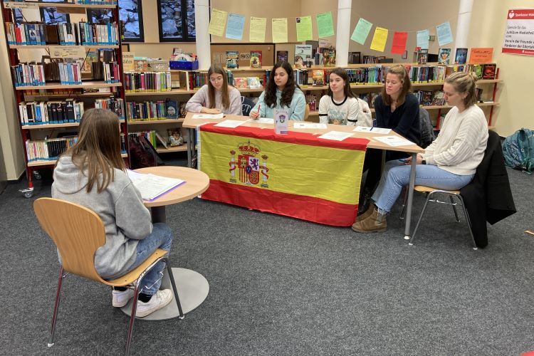 Das Interesse an der Wettbewerbsteilnahme war groß, so dass innerhalb der vier Spanischkurse des Jahrgangs eine Vorauswahl erfolgte. Beim Schulwettbewerb am 22. Februar traten dann jeweils die beiden kursbesten Schülerinnen und Schüler gegeneinander an und begeisterten die fünfköpfige Jury von ihrem Können.