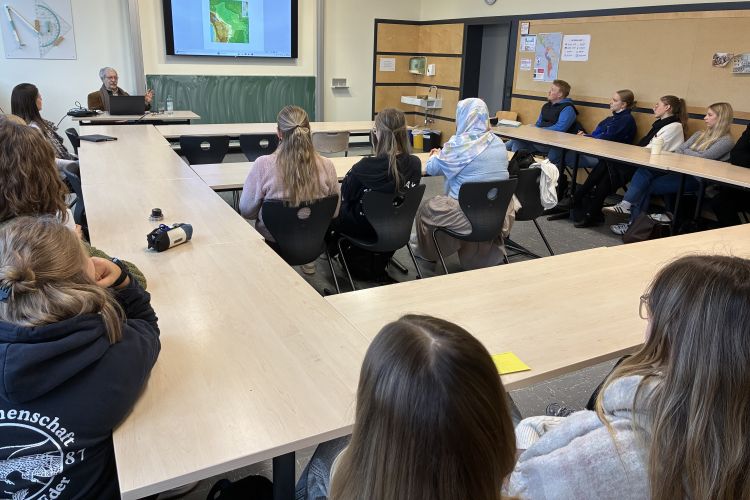 Mittels Wirtschaftskarten und geologischer Karten erläuterte Herr Schwiening eindrücklich seine Tätigkeit als Entwicklungshelfer im Bereich der Landerschließung. Dabei verknüpfte der Vortrag Wissen mit Nachhaltigkeitsfragen. Landerschließungsaspekte und der Umgang mit Ressourcen wurden als globale Verantwortung insbesondere auch gegenüber den indigenen Bevölkerungsgruppen Boliviens dargestellt - ergänzend und passend zum Lehrplan, aber zugleich veranschaulicht durch die langjährigen Erfahrungen und profunden Landeskenntnisse des Referenten. Und sehr schnell wurde deutlich, dass die aktuelle wirtschaftliche Lage des Landes eng mit den politischen Entwicklungen der letzten Jahrzehnte zusammenhängt, so v.a. mit der langen Regierungszeit des ehemaligen ersten indigenen, jedoch nicht unumstrittenen Präsidenten Evo Morales.