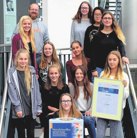 Technologie entwickelt und auf einem Poster oder in einem Video dokumentiert werden. Der Biologie-Chemie-Kombikurs entschied sich nach einem „Rundumschlag“ verschiedener Experimente schließlich für ein Modellexperiment zum bekannten Lotos-Effekte und produzierte dazu ein kurzweiliges Video. Mit diesem spannenden und kreativen Ansatz konnte die Jury begeistert werden. Ein Biologie-Chemie-Kombikurs setzt sich aus einem Biologie Orientierungskurs und einem Chemie Grundkurs zusammen. Die beteiligten Schüler haben in beiden Fächern denselben Lehrer. In einem speziellen schulinternen Lehrplan können die ähnlichen Unterrichtsinhalte in den zur Verfügung stehenden sieben Stunden pro Woche optimal aufeinander abgestimmt und zum besseren Verständnis vertieft betrachtet werden. Durch diese Synergieeffekte werden Inhalte auch deutlich schneller erarbeitet, sodass sich die freiwerdende Zeit für extra Projekte einsetzen lässt: So nahm der Kombikurs vor zwei Jahren an einer Untersuchung der Universität Göttingen zum Effekt von Mindmaps im naturwissenschaftlichen Unterricht teil. Der Biologie-Chemie-Kombikurs vor drei Jahren erreichte einen zweiten Platz bei einem bundesweiten Wettbewerb zu Untersuchungen der Bodenrespirationsfähigkeit, diese Daten fließen teilweise in Berechnungen zu den Auswirkungen des Klimawandels ein. Folgende Schüler haben am Wettbewerb teilgenommen: Celine Steiner, lsabell Christ, Charlotte Cronau, Jennifer Engelbach, Nina Engelhard, Svenja Ernst, Julia Fritsche, Jennifer Hung, Carolin Kaufmann, Nele Klinge, Philipp Knieling, Sophie Möller, Leonard Schraub, Simon Schwab, Chantal Steiner, Loris Stiebig, Johanna Tripp.
