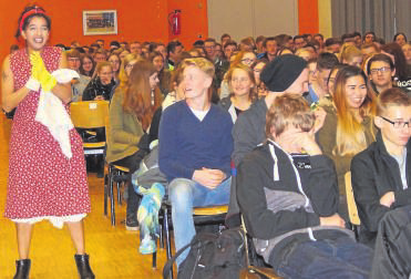 graf dracula sprach englisch 231116Eine moderne Version der klassischen Romanvorlage von Bram Stockers „Dracula” präsentierten jetzt die Ensemblemitglieder des TNT theatre britain in der Frankenberger Kulturhalle. Mit Dominic Brewer als blutrünstiger Graf und Charles Sandford als der im Dracula-Schloss gestrandete englische Anwalt Jonathan Harker in den Hauptrollen spielte das Ensemble vor 400 Edertalschülern das Stück in englischer Sprache. Die Autoren Paul Stebbing und Phil Smith haben aktuelle Bezüge zum Thema Klimawandel und die durch Menschenhand verursachte Schädigung der Umwelt in das Horrordrama eingebettet. Organisiert worden war die Veranstaltung von Katja Battenfeld. Die Lehrerin der  Edertalschule konnte bei der Verpflichtung des Ensembles auf die Kontakte ihres – im Publikum sitzenden – ehemaligen Kollegen Jürgen Merle zurückgreifen, der mittlerweile im Ruhestand ist und gegenüber der HNA von einer „grandiosen Leistung” der Schauspieler sprach. Auch die Schüler haben die Darsteller mit viel Applaus belohnt. (bs)