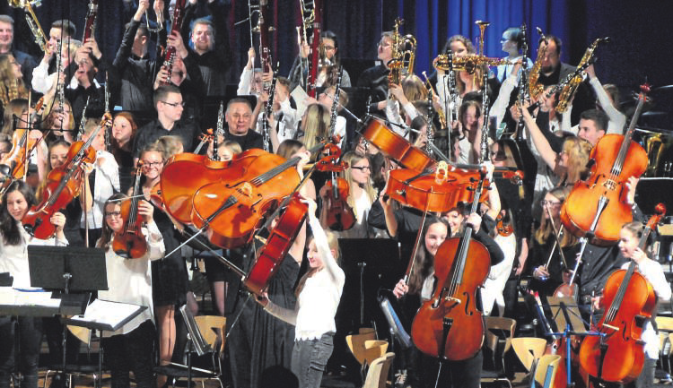 Hintergrund. Mit messerscharfen Riffs, furioser Rhythmik und effektvollen Arrangements hatte die Bigband mit „Welcome to the Jungle“ und „Africa“, geleitet von Torsten Herguth, Alexandra Opitz, eröffnet. Es gab junge Talente zu entdecken wie Benedikt Damm mit einem brillanten Trompetensolo (Konzert von Johann Nepomuk Hummel), Tanja Ahlborn mit wunderschönem Violenklang (Konzert von Franz Anton Hoffmeister) oder Jan-Luca Neumark mit einem gesanglichen Adagio in warmer Holzbläserfärbung aus einem Konzert für Fagott und Orchester von Carl Maria von Weber. Markus Wagener ließ seinen Nachwuchskünstlern Raum, sparte nicht mit Anerkennung, leitete das große Jugend-Sinfonieorchester auch bei den effektvollen, rhythmisch komplizierten Tutti-Stücken konzentriert und sicher. Bestes Vorbild für die Jüngeren: Am Freitagabend stellte sich das Jugendorchester des Gymnasiums mit Martin Fischer und Alexandra Opitz, am Samstagabend die Orchesterklasse 6e, geleitet von Matthias Müller, mit hoher Motivation und bunter Instrumentenvielfalt vor. Die in allen Stimmen gut besetzte Streichergruppe entfaltete in Stücken wie „Let it Go“, arrangiert von Konzertmeister Benedikt Huhn, ihren Streicherklang besonders schön. Für dieses reiche Spektrum an Orchesterfarben gab es am Ende begeisterten Beifall, bevor sich nach der Zugabe rund 150 junge Instrumentalisten aller Altersgruppen bei der Schulhymne „Pomp and Circumstances“ zum großen Finale auf der Bühne vereinten.