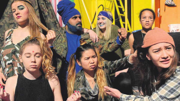 Aus der Frankenberger Kulturhalle ist eine Theaterwerkstatt geworden. In den vergangenen Tagen haben die Techniker mehrere hundert Meter Holz verbaut für die Zuschauertribüne und einen eigenen, diesmal farbenfreudigen Bühnenvorbau. Täglich probt Spielleiter Thorsten Jech mit seiner Theater-AG der Edertalschule für die Premiere der diesjährigen Theaterproduktion am kommenden Samstag. Das Probenfoto zeigt die Hauptfigur „Alice“ mit ihren alternativen Freunden, die ihre Nische in einer aggressiven Warenwunderwelt finden müssen. Karten für die Aufführungen am Samstag, 29. April, Sonntag, 30. April, Mittwoch, 3. Mai, Freitag, 5. Mai, und Sonnabend, 6. Mai, gibt es im Vorverkauf in der Buchhandlung Jakobi, im Lädchen gegenüber von der Schule, in der Buchhandlung Hykel sowie online unter http://thag-ets.de/stueckdesjahres/karten. Die Vorstellungen beginnen jeweils um 20 Uhr.