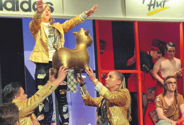 Der „süße Duft von Geld und Profit“ liegt in der Luft, die goldglitzernde Welt von Konsum, skrupelloser Macht und Markenklamotten - das ist die neue Utopie vom alten Märchenwunderland, in das im 19. Jahrhundert der englische Schriftsteller Lewis Carroll in zwei Kinderbuchklassikern seine liebenswerte „Alice“ schickte. Die Theater-AG der Frankenberger Edertalschule hat die Geschichte weiter gesponnen, in einer eigenen Bühnenproduktion aus Alice eine Teenagerin von heute gemacht, die als Spielball von Marktmechanismen und kapitalistischen Schreckgespenstern durch einen gefährlich verführerischen Weltkaufladen taumelt. Am Wochenende feierte das 44-köpfige Schülerensemble in der Frankenberger Kulturhalle mit „Alice“ eine berauschende Premiere, es gab minutenlangen, stehenden Beifall. „Lewis Carroll wäre stolz auf euch gewesen“, meinte Studiendirektor Uwe Neumann, als er nach dem Schlussbild dem großen Team von Darstellern, Technikern, Unterstützern, darunter viele Ehemalige, und Spielleiter Thorsten Jech dankte. Er nannte das von den Schülern von der ersten Textzeile bis zur letzten Bühnen-Schraube geplante und verwirklichte Theaterprojekt „eine großartige Leistung“. Wie ein roter Faden ziehen sich zwar noch Carrolls Figuren durch das Stück, aber aus dem „Märzhase“ ist nun ein „Commerzhase“ geworden, „Grinsekatze“ und „Känguru“ kommentieren episch das Geschehen - und das alles auf dem Tableau einer Einkaufs-Mall. Gerade dieser Bühnenbau mit seinen vielen Farben, Lichtwirkungen und Öffnungen, in denen Figuren überraschend auftauchen und verschwinden, bewirkt eine faszinierende dramaturgische Wirkung. Die Liste der Regieeinfälle und guten Spielideen ist unerschöpflich: Werbeslogans mit bitterem Sarkasmus, pfiffige Parodien auf alte Money-Money-Schlager, eine Art großer Choral mit Fagottbegleitung, gesungen von den „hohen Priestern des Kapitals“, der hingebungsvolle Tanz ums goldene Schwein, Manager in Goldklamotten, Polizisten, die in Reimen sprechen, Pizzabäcker, deren Familienehre zerbröselt, und eine alternative, kapitalismuskritische Jugendszene, der allenfalls noch die Emigration bleibt. Schon in Carrolls Wunderland starrte ein weißes Kaninchen permanent auf die Uhr. Die modernen Figuren der Theater-AG können mit ihren Smart-Watches sogar kommunizieren. In ihrer Inszenierung dominiert das Groteske, das absurd Überzeichnete, das besonders bunt schillernde Klischee. Doch dann sind es wieder die eindringlichen Einzelfiguren, in denen sich die ganz individuelle Auseinandersetzung der jungen Schauspieler mit einer von Konsum und Kommerz bedrohten existenziellen Abhängigkeit spiegelt. Dabei wird manchmal, obwohl das Stück vor den jüngsten politischen Weltereignissen geschrieben wurde, erschreckend viel aktuelle Realität sichtbar.