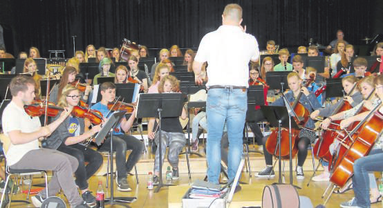 Vor dem Open-Air-Classic bei Beil üben Schüler mit Musikern des Staatstheaters