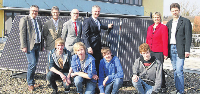 Großer Moment für die Edertalschüler Tim Engel, Moritz Ruhwedel, Fabio Lange und Stefan Schulte: Mit einem feierlichen Akt, dem sogar Staatssekretär Dr. Manuel Lösel beiwohnte, wurde jetzt die von ihnen gebaute Solaranlage auf dem Dach des naturwissenschaftlichen Traktes des Frankenberger Gymnasiums eingeweiht. Die Zwölftklässler der Fotovoltaik-AG hatten viele freie Wochenenden und Mittagspausen geopfert, um die vier Module von der Planung bis zum Aufbau fertigzustellen und zu installieren. „Sie sind diejenigen, die das MINT-Zertifikat mit Leben füllen. Sie sind Botschafter im besten Sinne des Wortes“, lobte Schulleiter Stefan Hermes die vier Oberstufenschüler, bevor die Anlage per Knopfdruck unter dem Beifall einiger Gäste in Betrieb genommen wurde. Neben dem Staatssekretär aus dem Kultusministerium waren auch die schulpolitische Sprecherin Claudia Ravensburg und der Geschäftsführer der Viessmann-Fotovoltaik GmbH, Joachim Rupp, zur Einweihung gekommen. Die Allendorfer Firma hatte den Schülern die Solaranlage zur Verfügung gestellt. In Zukunft wird die Anlage zu Demonstrationszwecken hin und wieder in Betrieb genommen. Mit der EGF sei vereinbart worden, dass sie nicht ständig laufe, sagte Bernhard Starck, der die Schüler betreut hat. Jedes Modul kann 250 Watt Strom erzeugen. „Damit könnte man drei Viertel eines Föhns betreiben oder ein halbes Waffeleisen“, rechnete Starck vor. „Ich freue mich riesig, dass wir an unserer Schule ab sofort eine richtige Solaranlage präsentieren können“, sagte der Physiklehrer. Er bedankte sich bei den genannten Schülern, die das „fast alleine“ hingekriegt hätten. Staatssekretär Dr. Manuel Lösel, der früher auch mal Schulleiter war, sagte, die Edertalschule sei „ein Traum“. „Ihr könnt stolz sein, dass Ihr diese Schule besuchen dürft“, sagte er den Schülern. Begeistert zeigte sich Lösel anschließend auch, als das Schulorchester und der Oberstufenchor eine sehr eigenwillige Inszenierung der Oper „Die Entführung aus dem Serail“ präsentierten. Er habe sich während des Studiums ein wenig Geld mit Klavierspielen in einem Tanzcafé verdient, verriet Dr. Lösel und erwies sich als versierter Opernkenner.
