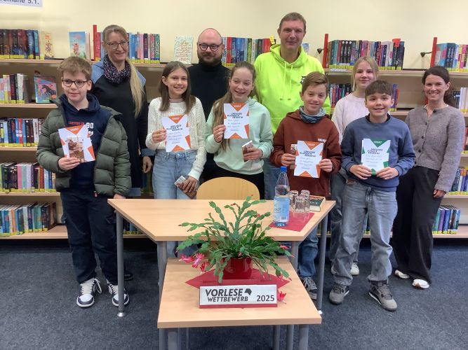 Die Schülerinnen und Schüler lasen nach einer kurzen Einführung in den Text zunächst aus einem selbst gewählten Buch vor, bevor sie in der zweiten Runde ihre Lesefertigkeiten anhand eines unbekannten Textes unter Beweis stellen konnten, was allen Teilnehmerinnen und Teilnehmern sehr gut gelang. Stellvertretend für die Jury lobte Herr Kanitz abschließend die Vorlesefähigkeiten aller Teilnehmerinnen und Teilnehmer und gratulierte Eva-Lina Wolski zum Sieg. Eva-Lina nahm ein Buchgeschenk, das von der Buchhandlung Hykel gestiftet wurde, entgegen und wurde ebenso wie alle anderen Vorleserinnen und Vorleser mit einer Urkunde ausgezeichnet.