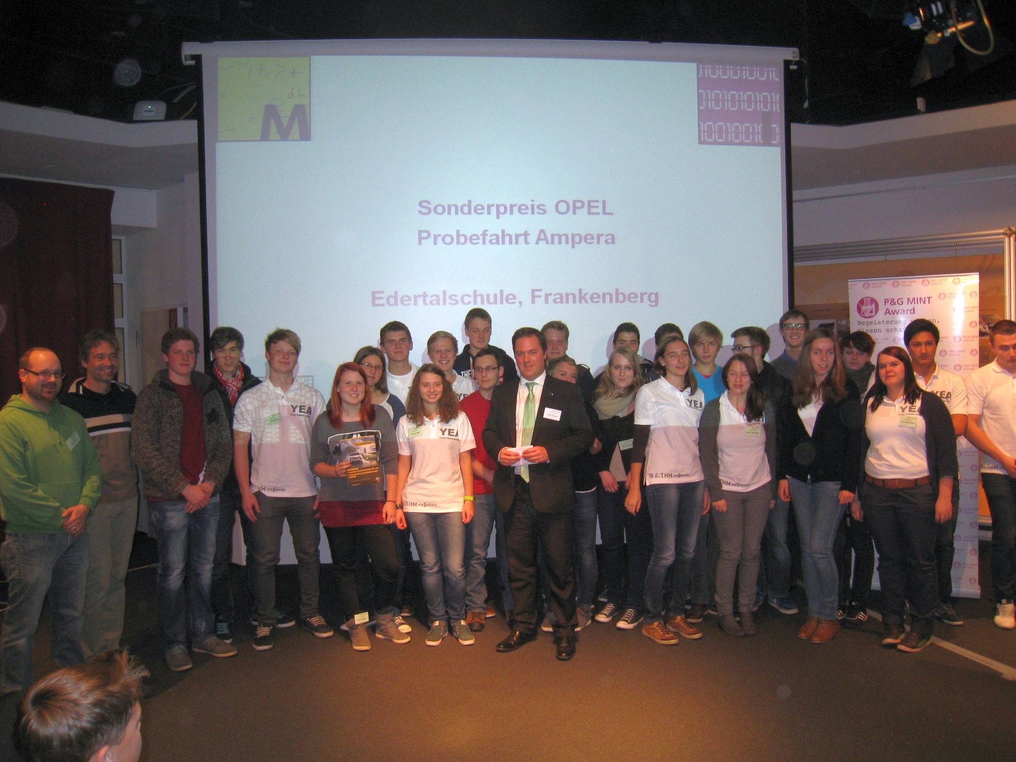 Am Montag den 19.11.2012 fand die 9. MINT-Messe statt, diesmal bei Opel in Rüsselsheim. Neben dem P&G Mint-Award konkurrierten die 26 teilnehmenden Schulen auch um zwei Sonderpreise der Firma Opel. Die Schüler der Edertalschule traten mit ihrem "Interdisziplinären Projekt - Erneuerbare Energien" an und konnte den Sonderpreis für die "beste Gesamtpräsentation" gewinnen. Hauptsächlich beteiligt waren dabei die Schüler des Physik-LKs (Q1), sowie das YEA-Team unter der Leitung von Herrn Starck und zwei "Jugend forscht"-Gruppen, die von Herrn Croll betreut wurden. Im Rahmen des Projekt wurde ein privat gespendetes Fotovoltaik-Modul aufgebaut und über einen Laderegler an einen Akku angeschlossen. Diese erneuerbare Energie dient in der Physik als hervorragende Gleichstromquelle, läd Kleinakkumulatoren, treibt das YEA-Wetterhaus an und sorgt für die Durchmischung der Algen-Freilandanlage auf dem Schuldach.