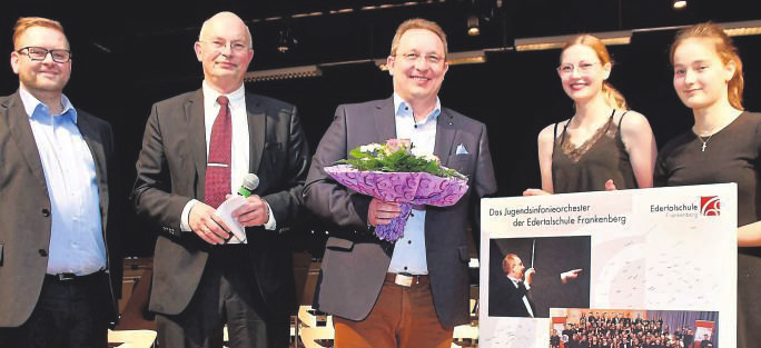 „Die Welt der Musik, die du unseren Schülern eröffnet hast, wird sie begleiten und immer wieder auch an dich erinnern“, meinte Oberstudiendirektor Claus-Hartwig Otto, als er im Namen der Schulgemeinde der Edertalschule Markus Wagener als langjährigen Leiter des Jugendsinfonieorchesters verabschiedete und seine musikpädagogische Arbeit an einer ganzen Generation junger Musiker würdigte. Nach 16-jähriger Dienstzeit, zuletzt in der Schulleitung des Frankenberger Gymnasiums, hatte Wagener im Herbst vergangenen Jahres die Leitung der Christian-Rauch-Schule in Bad Arolsen angetreten. „Dieser Wechsel geschah ziemlich abrupt, und es war bisher keine Gelegenheit, dass sich das Orchester von dir verabschieden konnte“, sagte Claus-Hartwig Otto, als er am Wochenende während des Frühjahrskonzerts der Schulorchester den sichtlich gerührten Konzertbesucher Wagener auf die Bühne bat. Im Jahr 2002 habe Markus Wagener das Schulorchester von seinem Vorgänger Willfried Jerrentrup (1938-2015) übernommen und auf dessen großartiger Orchesterarbeit aufgebaut.