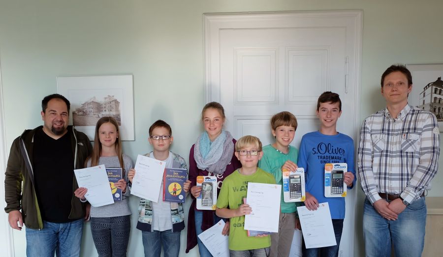 Für die Sieger des Monatsrätsels der Fachschaft Mathematik hat sich die Teilnahme gelohnt. Über ein Jahr hinweg haben die Jungen und Mädchen sich Monat für Monat mit den Aufgaben, die Herr Engel zusammengestellt hat, auseinandergesetzt. Die besten drei SuS des Jahrgangs fünf und sechs wurden nun für die sehr erfolgreiche Teilnahme ausgezeichnet. Während die ehemaligen Fünftklässler Christian Dippel, Laura Möbus und Fabian Mandel sich über einen Buchpreis freuen können, erhielten die nun Siebtklässler Finn Pohl, Gian-Luca Nieding und Janine Cramer einen Taschenrechner, um auch in Zukunft erfolgreich Mathematik betreiben zu können. Hervorzuheben ist, dass die Leistungen insgesamt sehr stark waren und die Punktzahlen deutlich über denen des Vorjahres lagen. Der Knobelwettbewerb beschert den Gewinnern neben den Sachpreisen auch wertvolle Punkte zum Erwerb des MINT-Zertifikats. Die Teilnahme lohnt sich also doppelt.